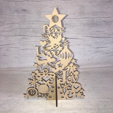 Beautifully laser cut festive freestanding Christmas tree with the words 'Peace, Love Joy' in the branches. This is a two part that slots together ...