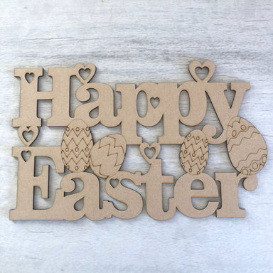'Happy Easter' plaque.Laser cut from 4mm MDF.Approx 25cm x 30cm.Smaller sizes available in this design, contact us for prices.Perfect for painting,...