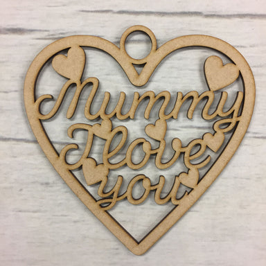This is a hanging heart plaque, with the sentiment 'Mummy I love you' within.The heart is 15cm tall.Laser cut in 3mm MDF and ready to decorate.Perf...