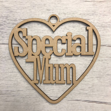 This is a hanging heart plaque, with the sentiment 'Special mum' within.The heart is 15cm tall.Laser cut in 3mm MDF and ready to decorate.Perfect f...