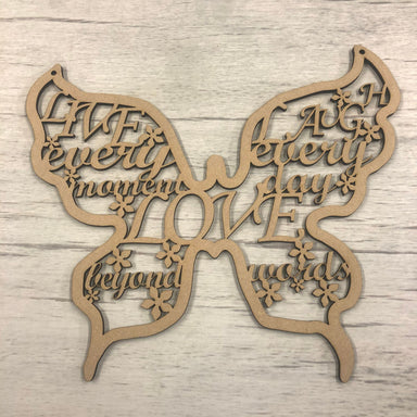Beautifully detailed butterfly hanging plaque.Precision laser cut from 4mm MDF.30cm wide, 26cm tall. Includes the sentiment 'Live every moment, Lau...