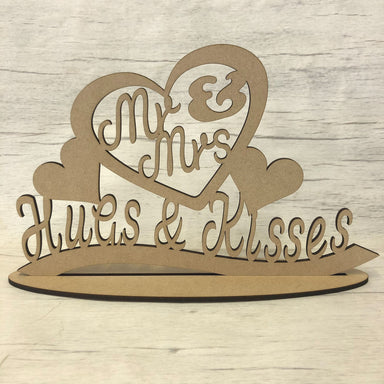 This is a free standing plaque made from 4mm MDF.Showing the message 'Mr & Mrs' within a heart and 'Hugs and kisses' underneath.Approximate siz...