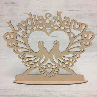 Beautifully laser cut table decoration, perfect for Weddings or Valentines. Features a pair of lovebirds facing each other, under a bed of hearts a...